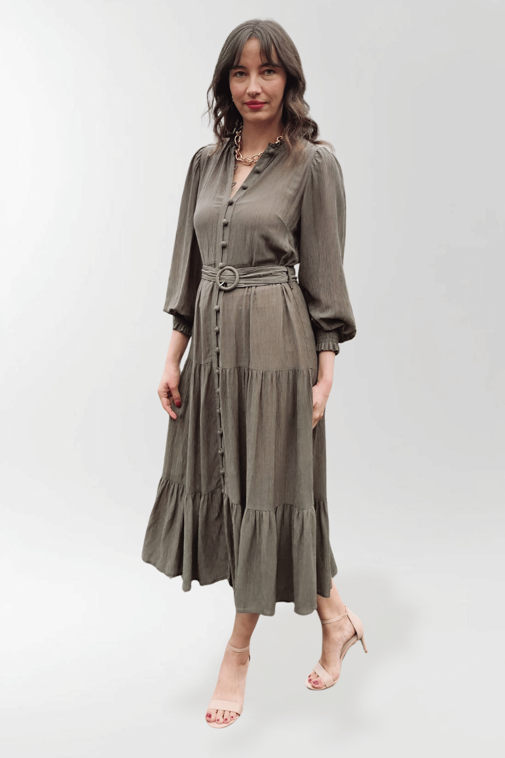Elevate your style with the Stella Tiered Midi Dress in Sage Green! Crafted from luxe Tencel fabrication, featuring a flowing tiered silhouette and a flattering midi length—perfect for both desk-to-dinner outings and special events.