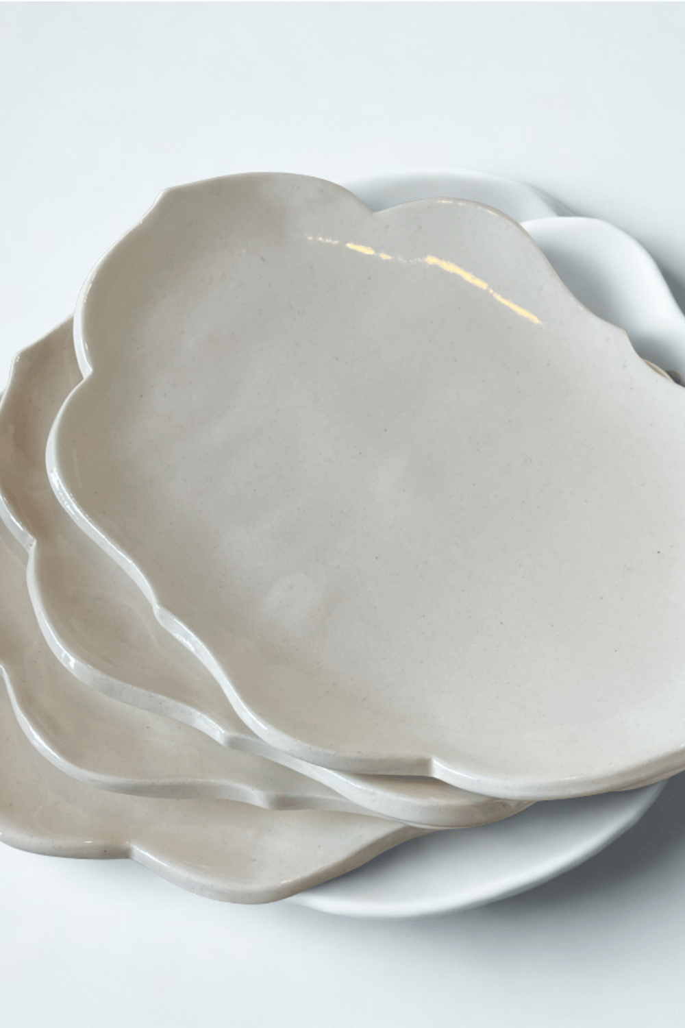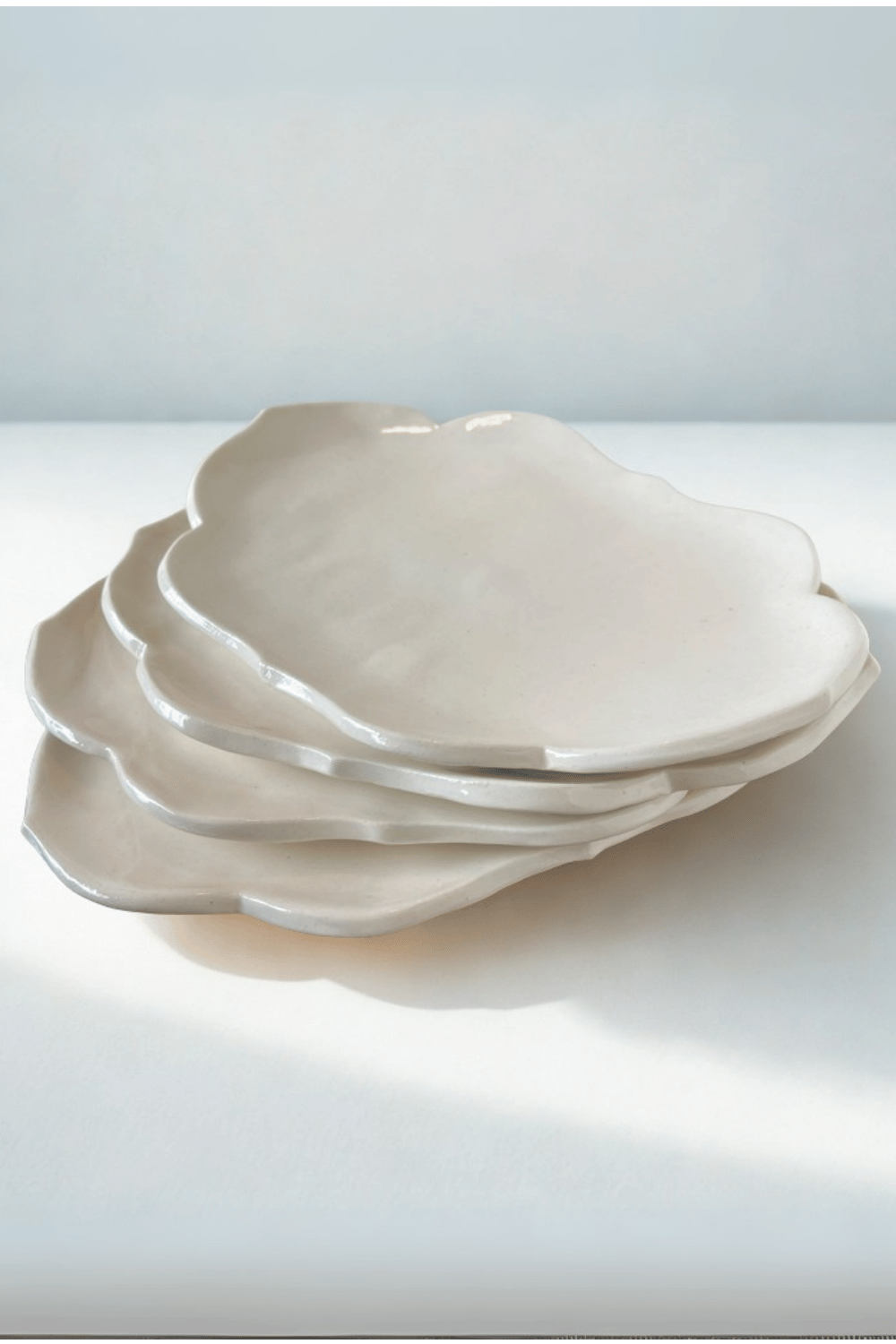 Handcrafted ceramic plates featuring an elegantly irregular, cloud-inspired design. The organic scalloped edges add depth and movement, creating a modern yet timeless piece perfect for everyday dining, styling, or display.