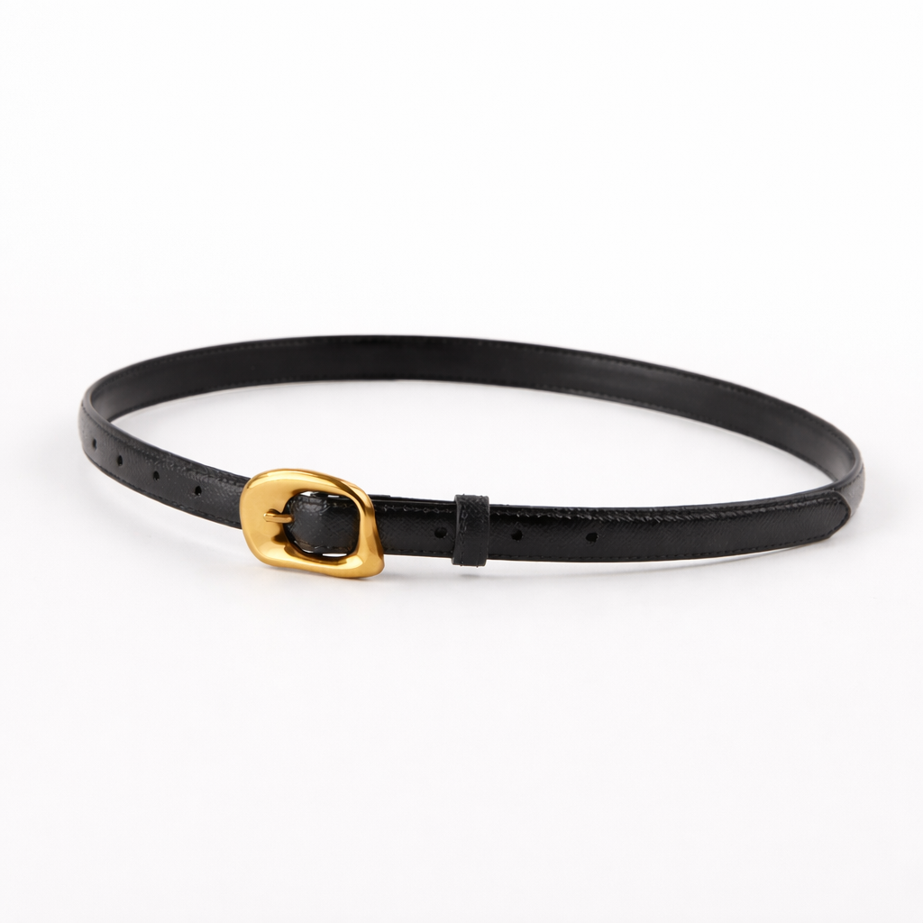 The Kelly Leather Belt is a timeless everyday essential, crafted from two-layer cowhide leather with a refined gold-tone geometric alloy buckle. Designed with a slim 2cm width and 105cm length, it pairs effortlessly with denim, tailoring, or dresses for a polished finish.